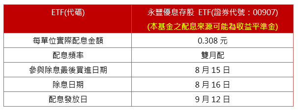 首創雙月配的00907永豐優息存股ETF(本基金之配息來源可能為收益平準金),最新配息金額出爐!依永豐投信公告,本次配息每受益權單位實際配發0.308元,預計8月16日除息、9月12日發放入帳,投資人於8月15日前買進或持有皆可參與本次配息。